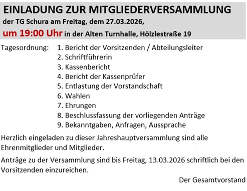 Zahlreiche Gäste, nahezu alle Stühle waren besetzt, fanden sich beim TG-Nachmittag 60+ in der Alten Turnhalle der TG Schura ein. Pünktlich um 15.00 Uhr wurde das Kuchen- und Kaffeebüffet eröffnet, dass dieses Jahr alle Erwartungen übertraf. Obstkuchen, Sahnetorten, Rührkuchen, dank fleißiger Bäckerinnen gab es alles, was das Herz begehrt.